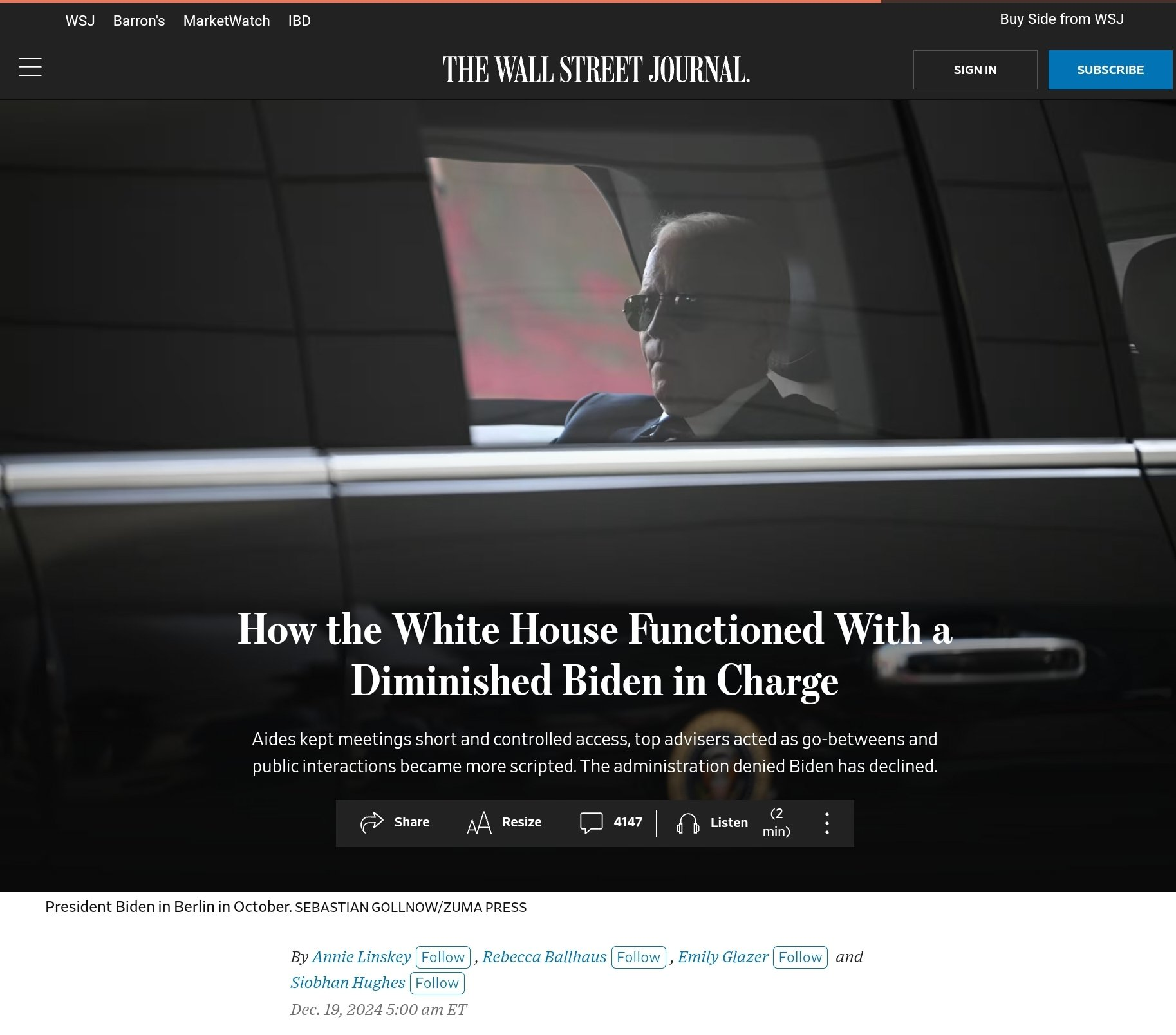 Wall Street Journal : La Maison Blanche a délibérément caché au public la détérioration rapide de l’état mental de Joe Biden tout au long de sa présidence.