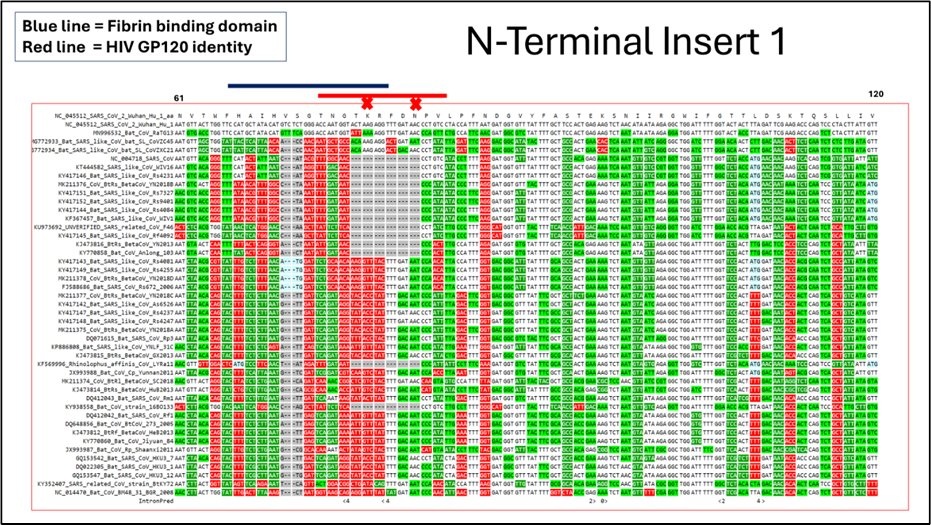 J’examine ici les régions de la protéine de pointe qui se lient à la fibrine, au fibrinogène ou aux deux. L’extrémité N de la protéine de pointe contient les trois peptides de liaison les plus forts et, étonnamment, ces régions sont également les trois insertions dans la séquence protéique qui sont propres au SARS-CoV-2 et qui ne se trouvent pas dans les sarbecovirus naturels.