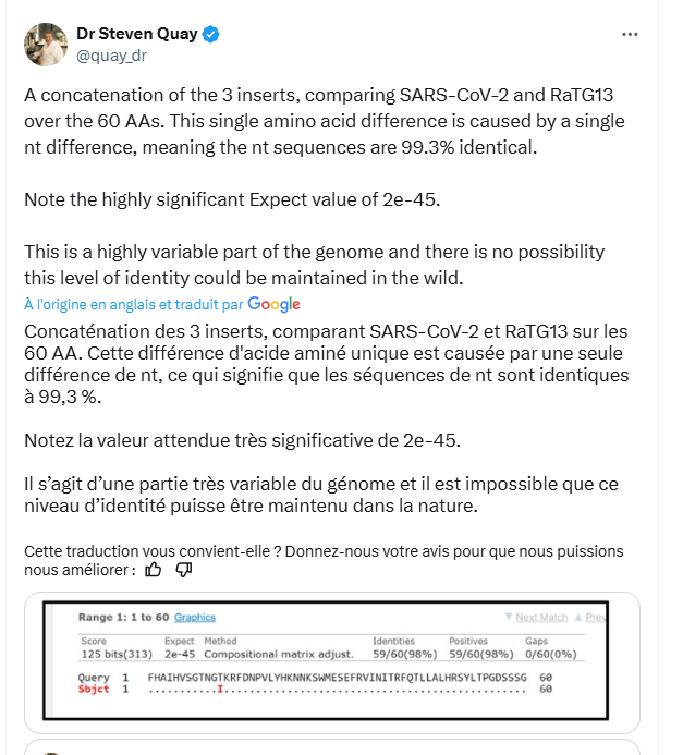 . 8. RaTG13 partage une homologie d’acides aminés de 59/60 et, pour l’insert 3, une homologie nt de 99,3 %. Étant donné que de nombreux articles suggèrent que RaTG13 a subi des expériences génétiques en laboratoire, on peut en conclure qu’il est probable que ces propriétés inhabituelles du SARS-CoV-2 ne soient pas apparues naturellement.