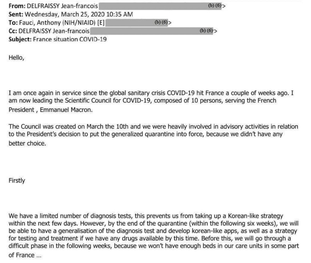 Je ne sais pas pour les autres (les Lévy, Buzyn, etc…) mais en ce qui concerne Delfraissy, là on sait, et depuis un moment, puisque l’Association des journalistes indépendants a réussi à faire publier officiellement par la Justice Américaine la liste des échanges par mail de ce même Fauci. 3000 pages mises à disposition sur Internet de qui voulait en prendre connaissance.