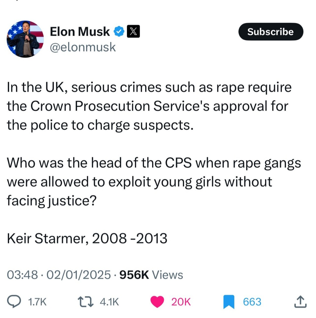 Steimer a été complice de VIOLS enGRANDE-BRETAGNE alors qu’il était à la tête du ministère public pendant 6 ans. Starmer doit partir et il doit faire face à des accusations pour sa complicité dans le pire crime de masse de l’histoire de la Grande-Bretagne. Elon Musk