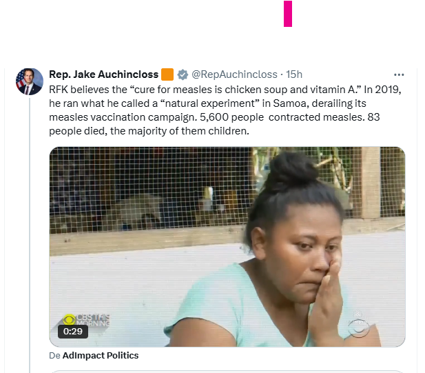 RFK Jr. n’a pas contribué à l’épidémie de rougeole aux Samoa. La méfiance à l’égard du vaccin RRO aux Samoa a commencé lorsque 2 nourrissons sont morts en 2018 après avoir reçu le vaccin RRO. Le gouvernement a suspendu le programme de vaccination RRO pendant 10 mois : https://onlinelibrary.wiley.com/doi/pdf/10.1111/jpc.14752#:~:text=Routine%20measles%20immunisation%20rates%2C%20always,after%20the%20July%20administrative%20error . https://www.theguardian.com/world/2019/dec/18/these-babies-should-not-have-died-how-the-measles-outbreak-took-hold-in-samoa