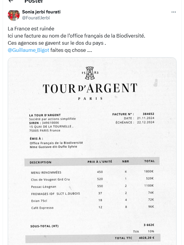La facture est un faux a indiqué La Tour d’Argent. Plusieurs journaux en ont fait état ces dernières semaines.