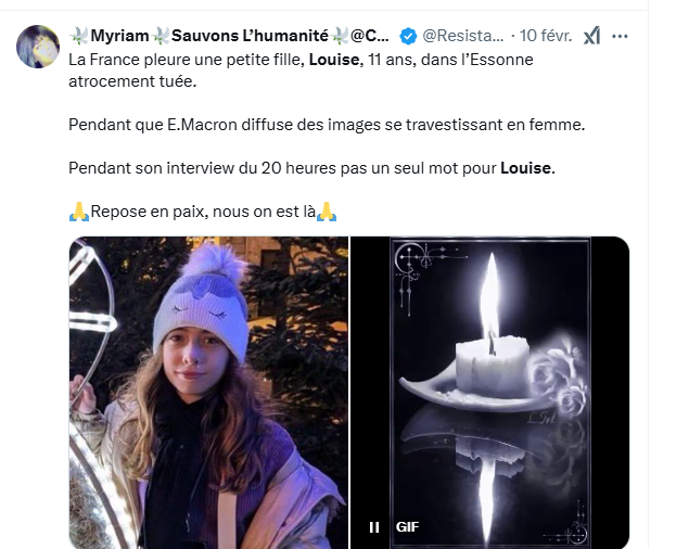 La France pleure une petite fille atrocement tuée qui à du beaucoup souffrir et avoir très peur. Pendant ce temps notre Président diffuse des images le travestissant en femme faisant le show.