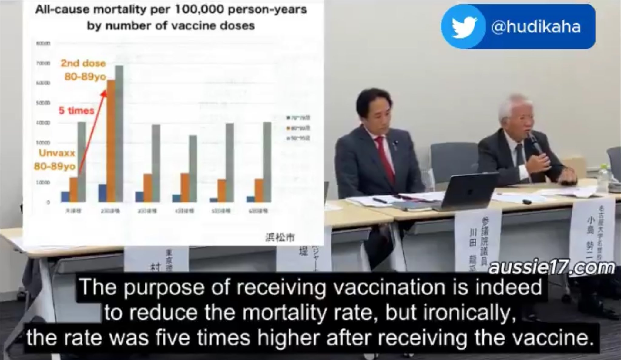 Professeur Dr. Seiji Kojima de l’Université de Nagoya : Par rapport aux personnes non vaccinées, le taux de mortalité est cinq fois plus élevé si l’on se fait vacciner deux fois. Le but de la vaccination est en effet de réduire le taux de mortalité, mais ironiquement, le taux était cinq fois plus élevé après avoir reçu le vaccin. Professeur Murukami de l’Université des sciences de Tokyo : « Le Japon prévoit un déploiement à grande échelle de vaccins auto-amplifiants, qui sont considérés comme des matières dangereuses… » « … D’ici le début du mois prochain, le Japon a le potentiel de déclencher une catastrophe mondiale ». « Les vaccins ne semblent pas efficaces. Ils ne fonctionnent pas. Ils manquent d’efficacité. Les vaccins à ARNm ont entraîné de nombreux décès, blessures et victimes. »