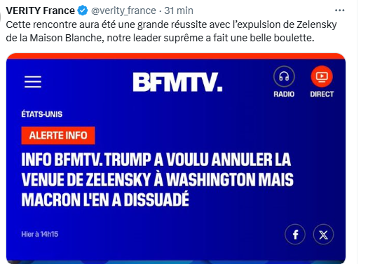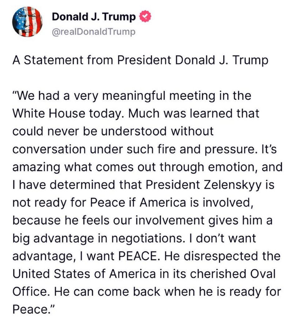 C’est officiel : Trump a expulsé Zelensky de la Maison Blanche, selon un responsable. « Les Ukrainiens imploraient qu’on réinitialise les choses », mais Marco Rubio et Mike Waltz leur ont dit que Zelensky devait quitter la Maison Blanche et revenir quand il serait « prêt » pour la paix, rapporte FOX.