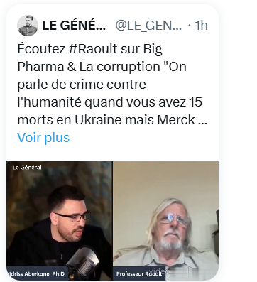 Écoutez #Raoult sur Big Pharma & La corruption « On parle de crime contre l’humanité quand vous avez 15 morts en Ukraine mais Merck a tué 50.000 personne en Australie, 50.000 et personne n’est allé en prison!! Je voudrais qu’on soit pas gouvernés par des voyoux »