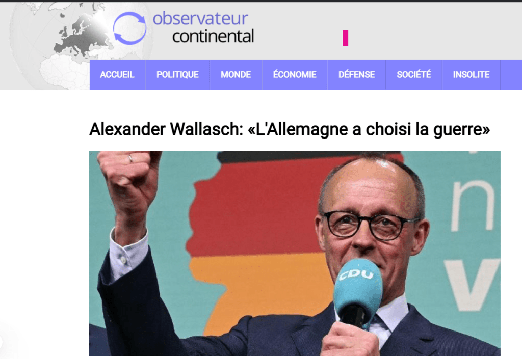 ns allemandes: L’Allemagne a choisi la guerre. C’est un avis qui est largement partagé en Allemagne. La radio allemande Kontrafunk, qui fait figure d’OVNI dans le paysage médiatique, étant pro-AfD, a, aussi, tristement conclu qu’avec Friedrich Merz, la situation du pays avec Friedrich Merz va continuer de se détériorer alors que l’Allemagne se trouve en récession depuis deux ans.