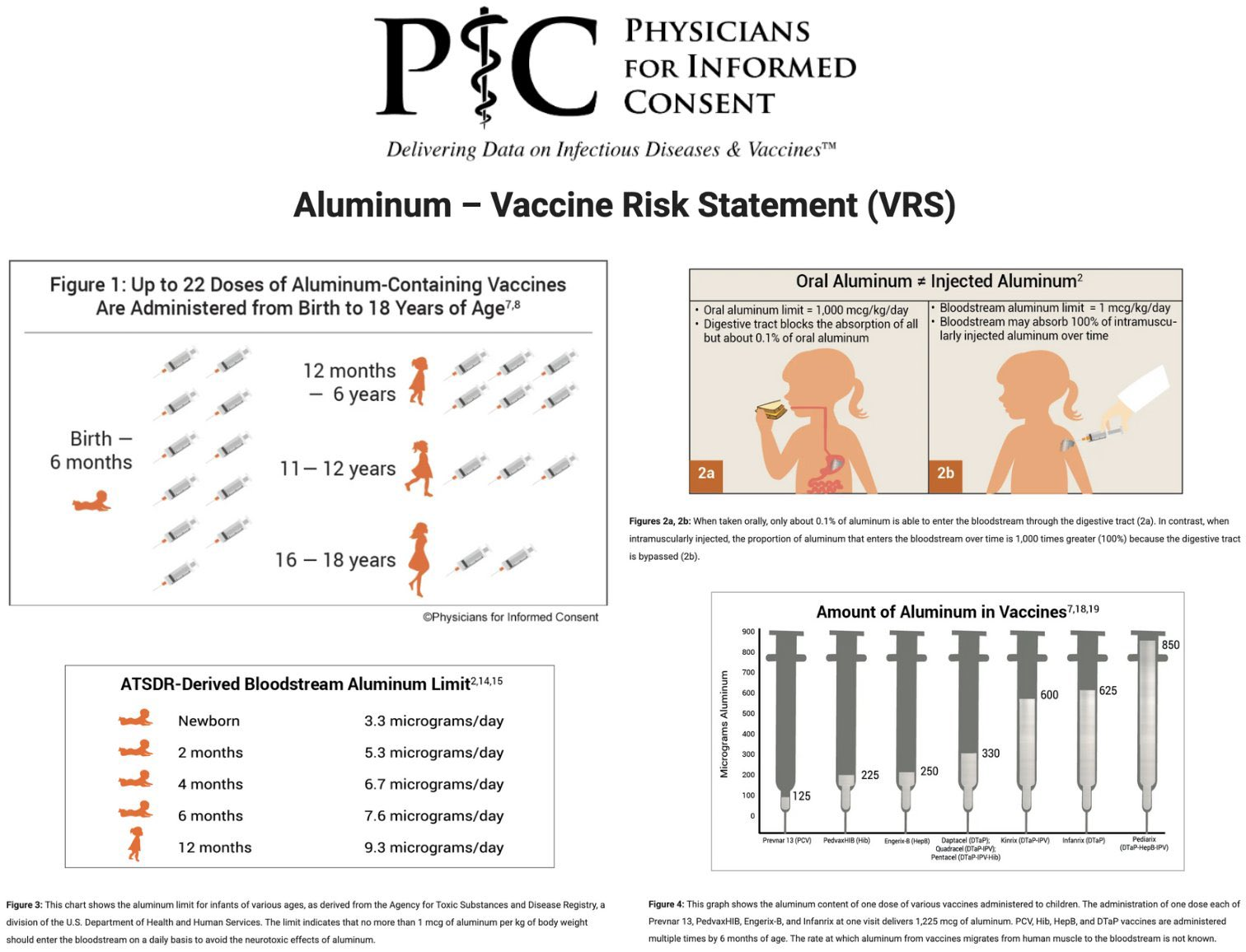 Hyper-vaccination et risque d’exposition : selon Physicians for Informed Consent, les enfants reçoivent jusqu’à 22 vaccins contenant de l’aluminium entre la naissance et l’âge de 18 ans, ce qui les expose à une neurotoxine connue.