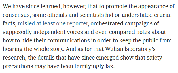 Le NYT publie un article qui considère que nous avons été DÉSINFORMÉS VOLONTAIREMENT sur l’origine du COVID 19 par les autorités. Ces dernières savaient depuis le début qu’il s’agissait d’une fuite de laboratoire.
