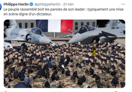 Macron le ton grave parlant aux troupes, derrière un Mirage et un rafale, lui au centre, sur une estrade dans son costume noir, cravate noir, oui, le ton est grave, Macron en chef de guerre, l’heure est grave, la France se prépare à la guerre, encore un discours, encore du blabla… Ras le bol, le danger pour notre existence c’est bien lui.