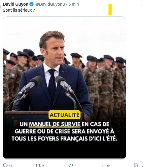 Si c’est un prétexte pour se relégitimer ou détruire le modèle social pour abaisser le budget de l’éducation nationale, de la recherche, de l’hôpital… c’est l’idée la + folle même du point de vue de la défense que l’on puisse imaginer, encore une fois, un pays ne peut pas se défendre même avec une très bonne défense si la société s’effondre, si en + son potentiel de croissance s’affaiblit car il n’a plus les moyens de se défendre, plus la volonté non plus.