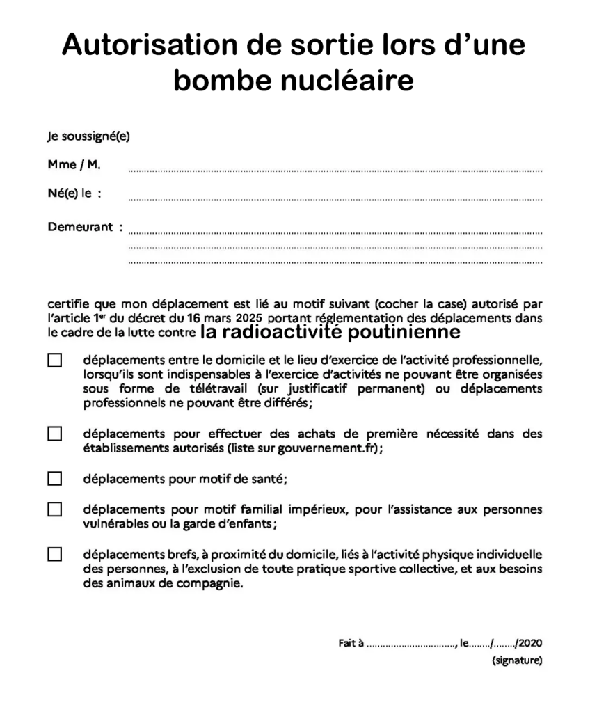 Ping: Une peur insidieuse qui paralyse la réflexion des idiots qui voient des russes partout? Bientôt une autorisation de sortie lors d’une bombe nucléaire – Qui m'aime me suive…