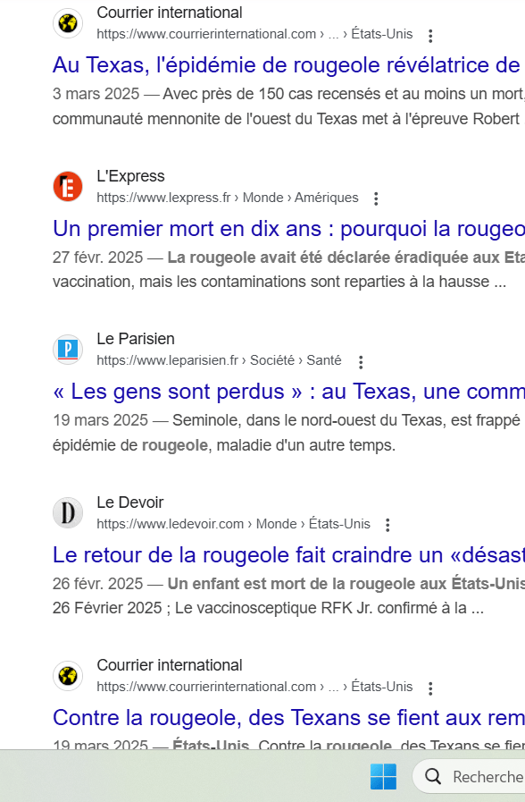 Qui n’a pas eu la rougeole il y a quarante ou cinquante ans ? Ce n’est que depuis qu’ils ont vendu un vaX contre Tout que les médias en parlent. Ils oublient aussi que la mort fait partie de la vie… Ne manque plus qu’une injection contre la bêtise et la boucle sera bouclée.