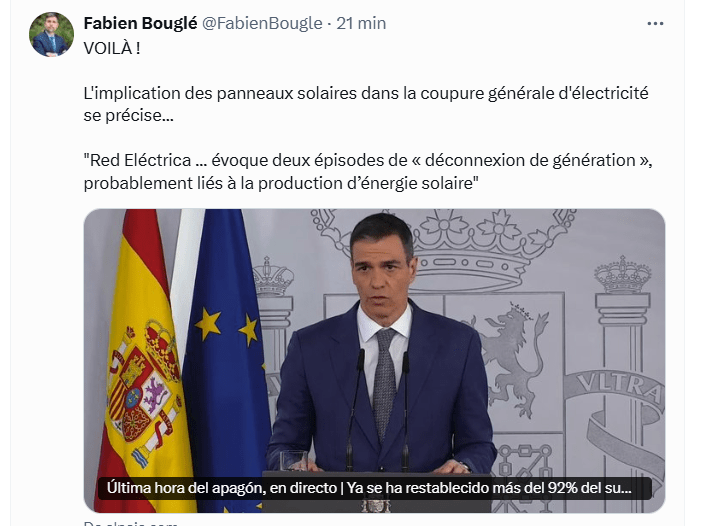 En février, Red Electrica avait alerté sur le risque de panne électrique à cause des énergies renouvelables. Mais on va parler réchauffement climatique, les Russes, etc… pour éviter l’éléphant dans la pièce.