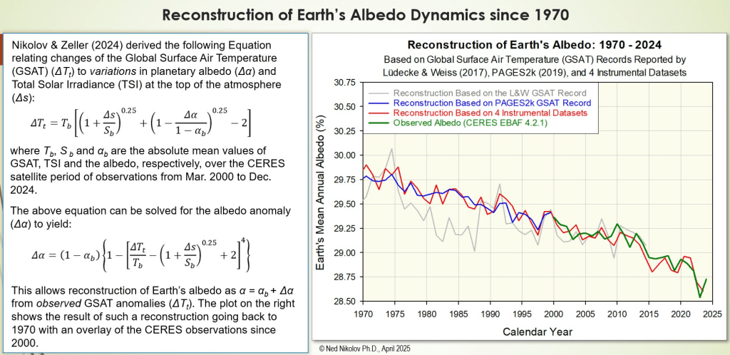 Les données de la NASA montrent clairement que le réchauffement des 55 dernières années a été causé par une baisse de l’albédo de la Terre, principalement due à une réduction des nuages bas au-dessus des océans, un processus qui n’a rien à voir avec les émissions de carbone humaines (voir Nikolov & Zeller 2024 : https://mdpi.com/2673-7418/4/3/17… ).