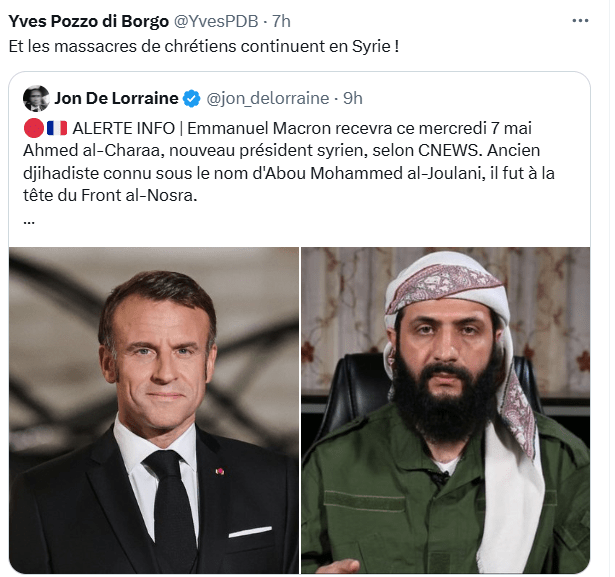 . Les Alawites ont été victimes d’attaques sectaires. Des femmes ont été enlevées, des hommes ont disparu, des corps ont été retrouvés. Les Druzes se sont soulevés. Le pays est en ébullition. L’initiative d’Emmanuel Macron interroge donc. Surtout au moment où l’on s’apprête à se remémorer l’horreur du 13 novembre. Devait-on accueillir à Paris en grande pompe un idéologue à l’origine de ces massacres ? La réponse est dans la question.