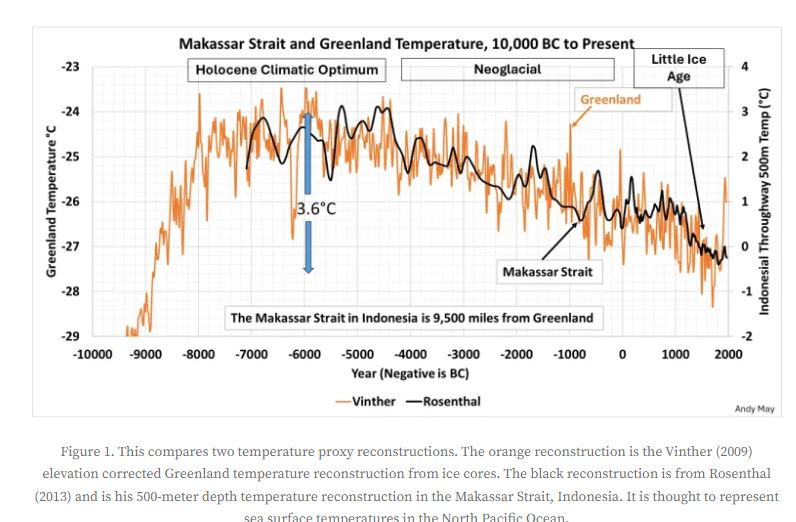 Le graphique compare deux reconstructions de température sur 10 000 ans, de 10 000 av. J.-C. à aujourd’hui. La courbe orange représente la température corrigée en altitude au Groenland (Vinther, 2009), basée sur des carottes de glace. La courbe noire montre la température à 500 mètres de profondeur dans le détroit de Makassar, Indonésie (Rosenthal, 2013), reflétant les températures de surface de l’océan Pacifique Nord. Le détroit de Makassar est à 9 500 miles du Groenland. On observe un optimum climatique holocène autour de -8 000 ans et un refroidissement durant le Petit Âge glaciaire. La différence maximale entre les deux courbes est d’environ 3,6 °C.