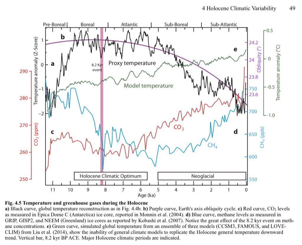 Il faisait nettement plus chaud qu’aujourd’hui pendant l’optimum holocène. Le niveau de la mer était plus élevé, tout comme le contenu thermique des océans. L’Arctique était généralement libre de glace en été et le pergélisol a dégelé. Durant cette période, les concentrations de CO2 et de méthane ont considérablement diminué en raison de la croissance accrue de la biosphère et de la présence accrue d’eaux libres à haute latitude. Il est peu probable que les hivers aient été plus frais malgré une insolation moindre, comme en témoignent les températures et les océans chauds du sud. Les reconstructions multiproxy modernes gèrent mal les proxies et les températures trop lisses.
