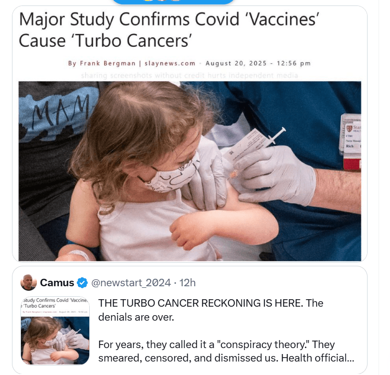 CANCER TURBO ! Les dénégations sont terminées !!! https://journalofindependentmedicine.org/articles/v01n03a02 Pendant des années, ils ont qualifié cela de « théorie du complot ». Ils nous ont calomniés, censurés et rejetés. Les responsables de la santé, les médias grand public et leurs « vérificateurs de faits » ont insisté sur le fait qu’il n’y avait « AUCUNE PREUVE » que les vaccins à ARNm étaient liés à des cancers agressifs. Ce mur de dénégation a désormais été balayé par la science évaluée par des pairs.
