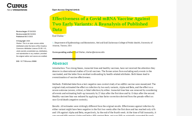 l’article intitulé « Effectiveness of a Covid mRNA Vaccine Against Two Early Variants: A Reanalysis of Published Data » publié sur Cureus par Eyal Shahar. J