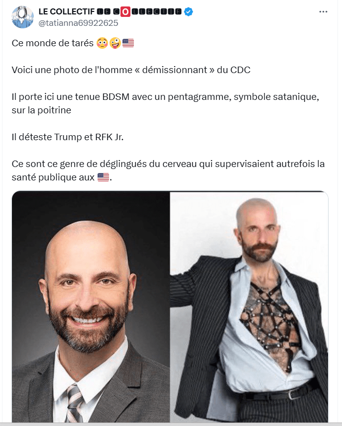 Voici une photo de l’homme « démissionnant » du CDC Il porte ici une tenue BDSM avec un pentagramme, symbole satanique, sur la poitrine Il déteste Trump et RFK Jr.