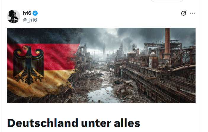 L’Allemagne était peu ou prou le moteur industriel de l’Europe mais elle a choisi le pari de vieillir, de se désindustrialiser, de rater le tournant de la robotique et de l’IA pour garantir que leurs grues de construction sur des chantiers immobiliers à l’arrêt seront superbement carbone-neutres. Audacieux, n’est-ce pas ? À présent, les prévisions de la Bundesbank ressemblent à une pochette d’un album de black métal avec 0% de croissance, 0% de sourire et 100% de serrage de dents.