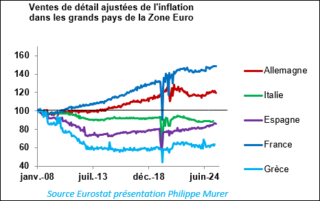 D’ailleurs, ces problèmes de salaires pire encore en Italie, Espagne… se lisent sur les ventes de détail qui baissent dans ces pays.
