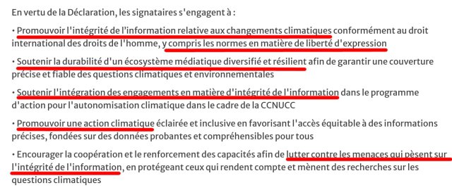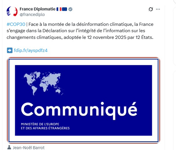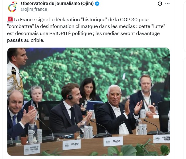 La France signe la déclaration « historique » de la COP 30 pour « combattre » la désinformation climatque dans les médias : cette « lutte » est désormais une PRIORITÉ politique ; les médias seront davantage passés au crible.