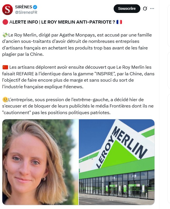 (compte d’actualités conservatrices), cumulant plus de 170 000 vues en quelques heures. Il lie l’affaire à une autre controverse : Leroy Merlin aurait, sous pression de l' »extrême-gauche », coupé ses publicités au média Frontières (proche de milieux patriotes) et publié des excuses pour ne pas « cautionner » ses positions. Des utilisateurs comme @KbgStream