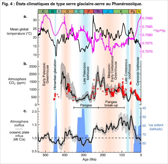 Il illustre bien les alternances icehouse/greenhouse, avec un bon suivi entre le ratio tectonique et la température (corrélation ~0.6, lag négligeable).Quelques points alignés avec ton commentaire, confirmés ou nuancés par l’article et le consensus géologique récent :Période fraîche actuelle : Oui, nous sommes dans un état icehouse (ère froide) depuis le Cénozoïque, avec glaciation polaire et interglaciaire actuel. Le Phanérozoïque a connu des phases beaucoup plus chaudes (greenhouse) sans calottes permanentes.