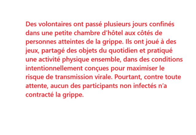 https://journals.plos.org/plospathogens/article?id=10.1371/journal.ppat.1013153 Des volontaires ont passé plusieurs jours confinés dans une petite chambre d’hôtel aux côtés de personnes atteintes de la grippe. Ils ont joué à des jeux, partagé des objets du quotidien et pratiqué une activité physique ensemble, dans des conditions intentionnellement conçues pour maximiser le risque de transmission virale. Pourtant, contre toute attente, aucun des participants non infectés n’a contracté la grippe.