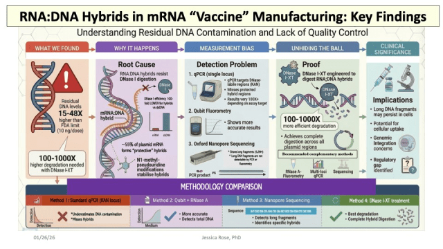 L’infographie signée par Jessica Rose, PhD (janvier 2026), résume des conclusions d’une recherche récente (préprint ou preprint publié fin 2025) sur la contamination par ADN résiduel dans les vaccins à ARNm COVID-19 (Pfizer et Moderna).