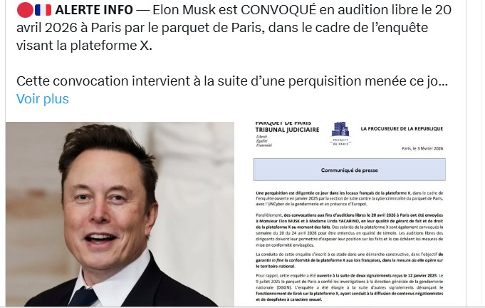Cette convocation intervient à la suite d’une perquisition menée ce jour dans les locaux français de X, dans une enquête ouverte pour des faits liés notamment à la diffusion de contenus illicites, au fonctionnement de Grok et à des infractions pénales en bande organisée.