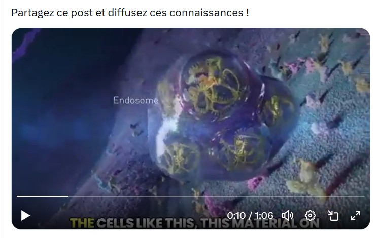 Une vidéo fantastique qui explique clairement le rôle de l’ARNm et les mécanismes cellulaires impliqués. Regardez-la, elle ne dure qu’une minute : elle explique ces mécanismes d’une manière désormais indiscutable.