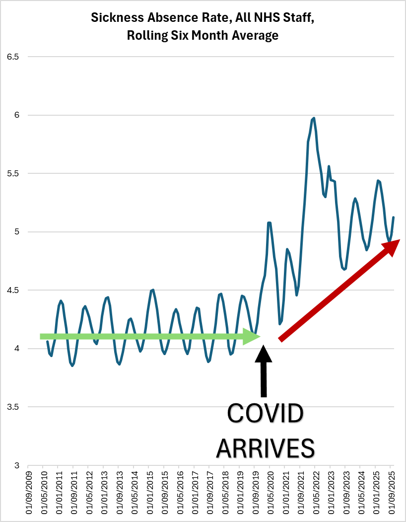 une tendance claire et documentée dans les données officielles de NHS England Digital : le taux d’absence pour maladie du personnel du NHS en Angleterre est resté significativement plus élevé après l’arrivée du COVID-19 qu’avant.