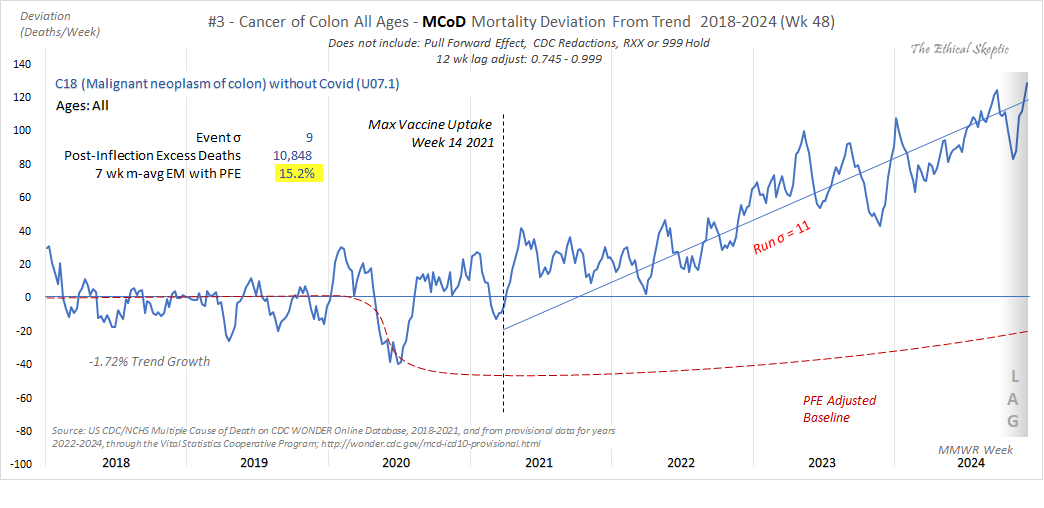 Le graphique , provenant de « The Ethical Skeptic » (TES), illustre les variations hebdomadaires de la mortalité due à des causes multiples de décès (MCOD) pour les néoplasmes malins du côlon (code CIM-10 C18) pour tous les âges aux États-Unis, de 2018 à la semaine 48 de 2024. Il montre les écarts par rapport à une tendance de référence antérieure à 2020 (ajustée pour une croissance/déclin annuel de -1,72 %), intégrant des éléments tels qu’une moyenne mobile sur 7 semaines, des ajustements pour les excès post-infection et des exclusions pour les effets d’anticipation (PFE), les occultations du CDC ou certaines catégories de mise en attente. Éléments clés du graphique :