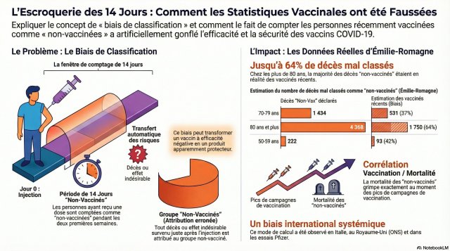 L’infographie cite des chiffres précis (ex. 64 % des décès « non-vaccinés » chez les 80+ ans seraient en réalité des vaccinés récents, avec 1 750 décès mal classés sur 4 368) et provient d’une étude publiée en 2025 dans Autoimmunity (journal de Taylor & Francis) : « Classification bias and impact of COVID-19 vaccination on all-cause mortality: the case of the Italian region Emilia-Romagna » par Alessandria, Trambusti, Malatesta et Donzelli.
