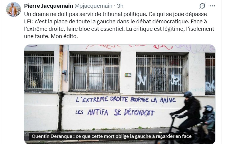 Dans le contexte actuel (février 2026), avec la mort de Quentin Deranque (militant nationaliste tué à Lyon, enquête pointant vers des liens avec l’ultragauche/Jeune Garde), Jacquemain est hyper-visible :