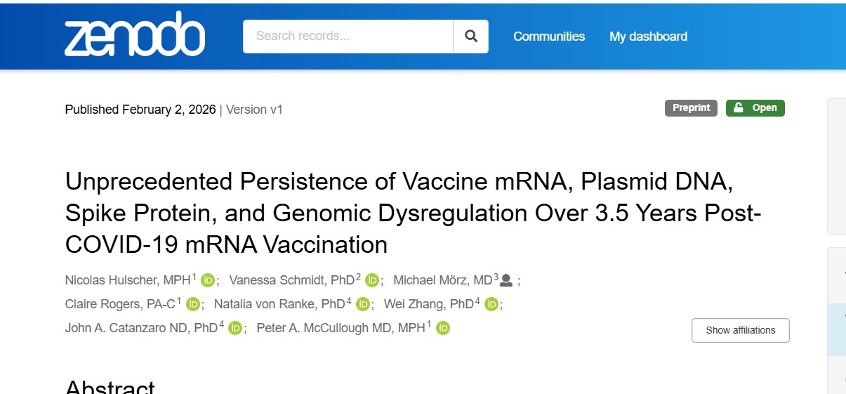 Persistance sans précédent de l’ARNm vaccinal, de l’ADN plasmidique, de la protéine Spike et dérégulation génomique plus de 3,5 ans après la vaccination contre la COVID-19 par ARNm. Zenodo.https://doi.org/10.5281/zenodo.18460099