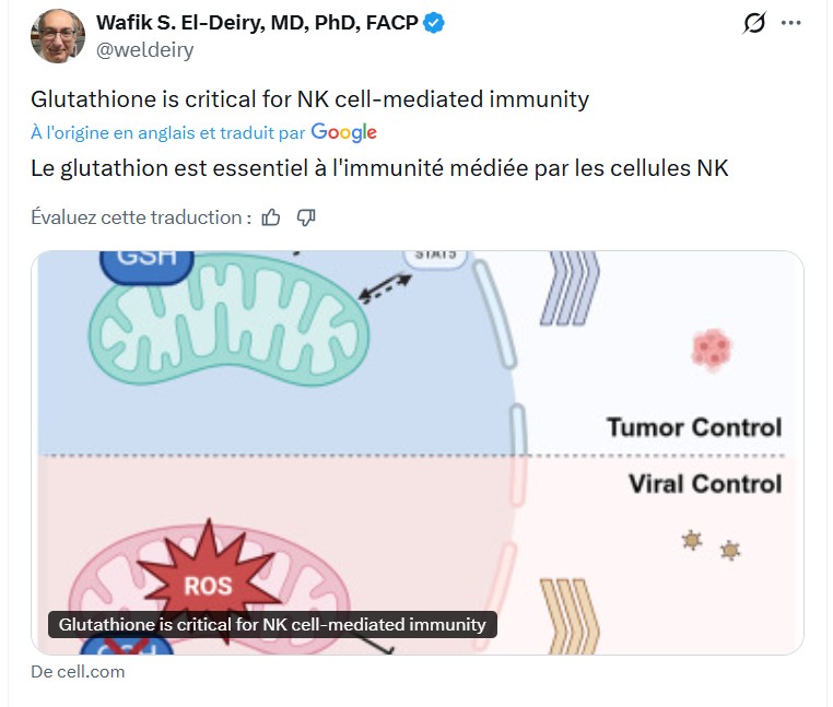 - Le GSH potentialise les effets des cytokines (IL-2 + IL-12) pour renforcer les fonctions NK contre des infections comme la tuberculose (études dès 2008, confirmées par la suite).