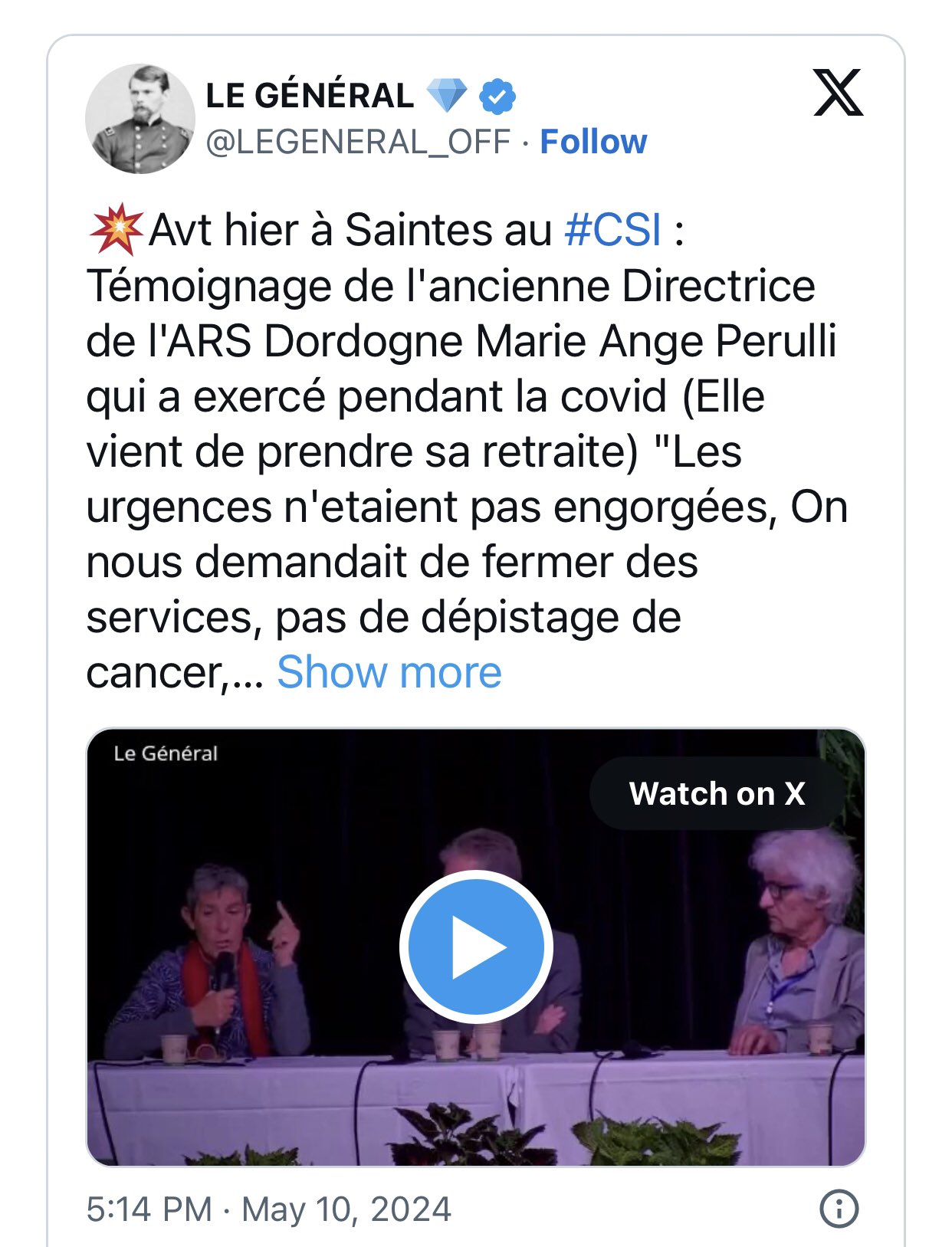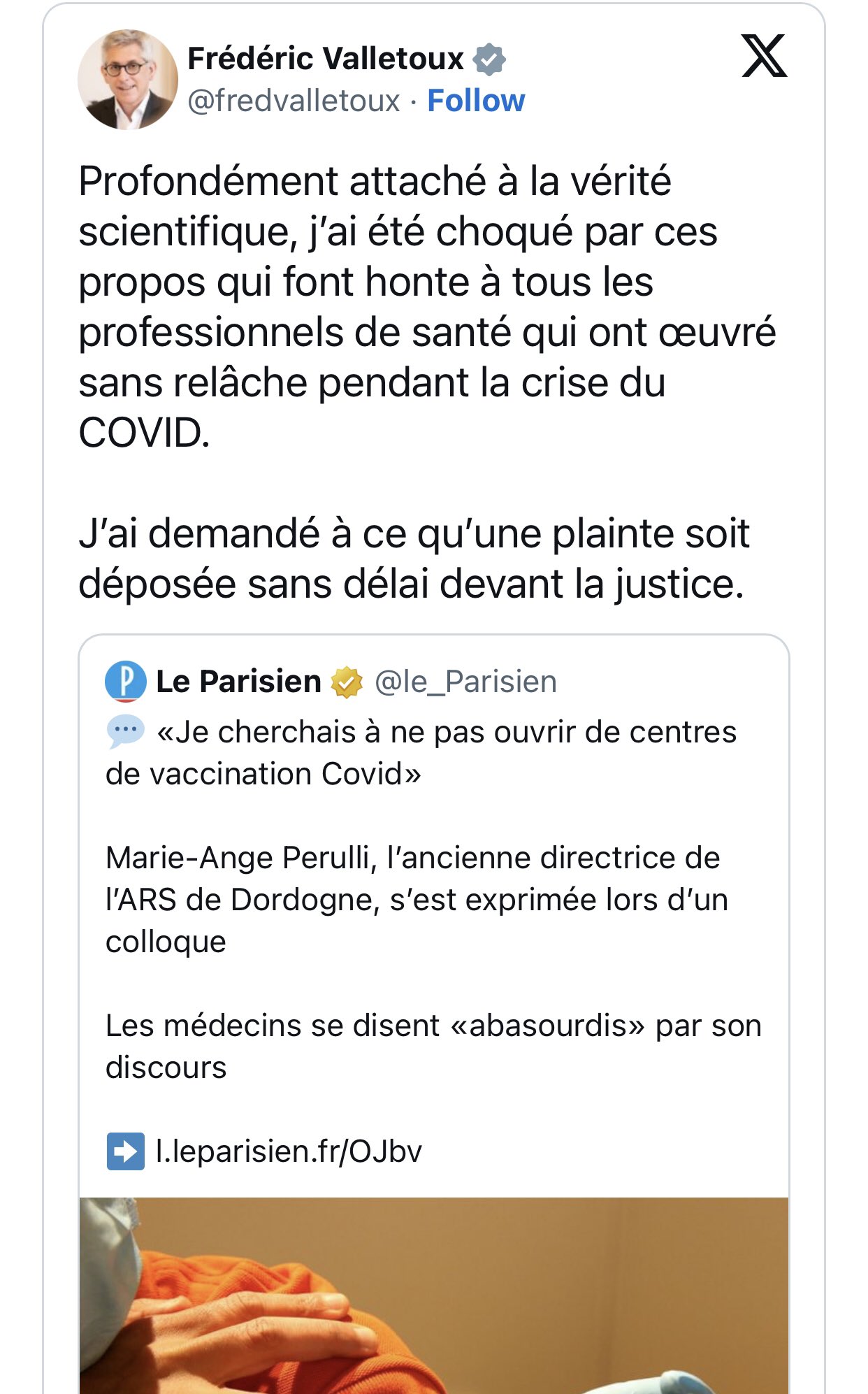 Le ministre de la santé porte plainte contre Marie–Ange Perulli en 2024 . Car l’ex directrice des ARS de Dordogne pendant le Covid a dénoncé au CSI la honteuse politique du gvt: «Les urgences n’étaient pas engorgées, on nous demandait de fermer des services…»