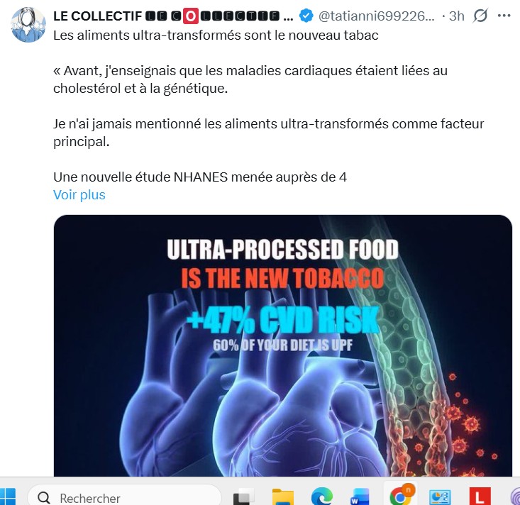 Une nouvelle étude NHANES menée auprès de 4 787 adultes américains 🇺🇸 a révélé que la consommation la plus élevée d’aliments ultra-transformés était liée à un risque accru de 47% de crise cardiaque et d’accident vasculaire cérébral, après ajustement pour l’âge, le tabagisme, le revenu et d’autres facteurs.