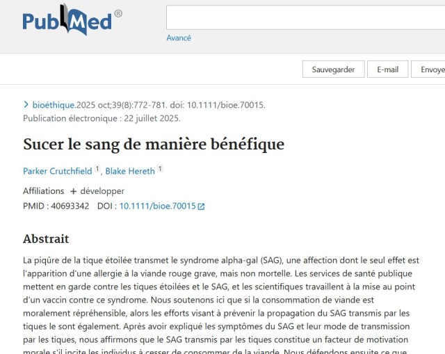 Oui, cette idée a émergé dans un article académique controversé publié en 2025 par deux professeurs en bioéthique de la Western Michigan University : Parker Crutchfield et Blake Hereth. Dans leur papier intitulé Beneficial Bloodsucking (publié dans la revue Bioethics), ils explorent l’hypothèse que propager le syndrome alpha-gal (AGS) pourrait être considéré comme un « bioenhancer moral » (moral bioenhancer) pour encourager – voire forcer – les gens à adopter des régimes végétaux, en supposant que la consommation de viande est moralement répréhensible.