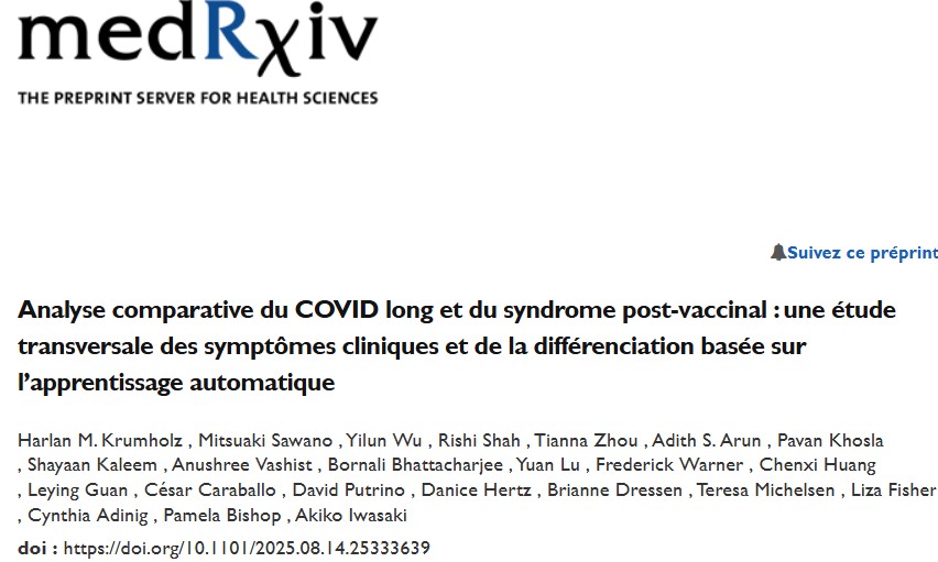 Oui, il est possible de distinguer un Covid long d’une « lésion vaccinale » (ou syndrome post-vaccinal, PVS en anglais) grâce à des études récentes, même si les symptômes se chevauchent beaucoup. La description que vous citez correspond précisément à une étude prépubliée en août 2025 sur medRxiv (encore en attente de relecture par les pairs), intitulée Comparative Analysis of Long COVID and Post-Vaccination Syndrome: A Cross-Sectional Study of Clinical Symptoms and Machine Learning-Based Differentiation. medrxiv.org +1Symptômes similairesLes deux conditions partagent de nombreux symptômes invalidants :