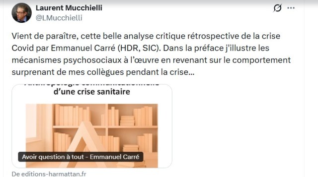 Emmanuel Carré propose une analyse communicationnelle rigoureuse de cette période en relisant les auteurs des sciences de l’information et de la communication, de la psychologie sociale et de l’anthropologie. Une préface documentée de Laurent Mucchielli, directeur de recherche au CNRS, complète ce décryptage des processus systémiques à l’œuvre.