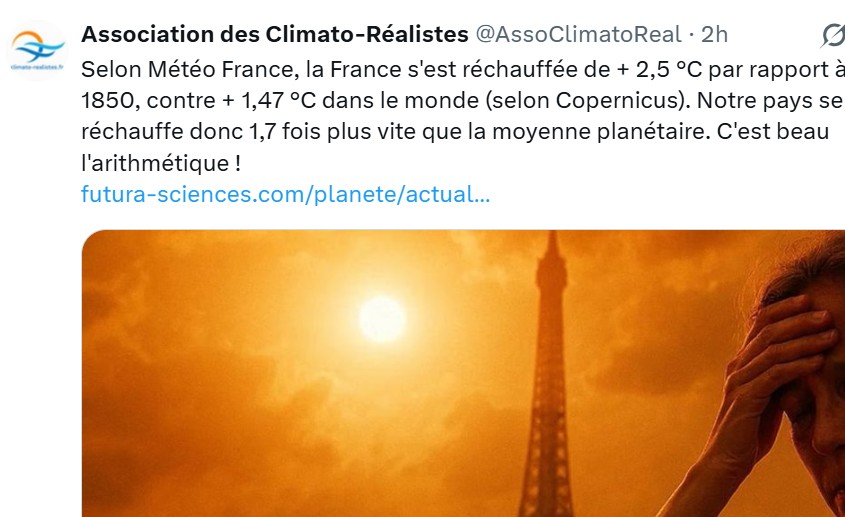 Les experts escrologistes ont frappé fort, la France se serait réchauffée de 2,5° depuis 1850 contre 1,5 pour le reste de la planète…N’imaginez pas qu’ils s’appuient sur des données vérifiable…Météo France n’existait pas en 1850…Tout découle des mathématiques, des modèles informatiques, bref du monde FACTICE dont parle Didier Raoult