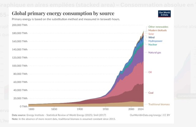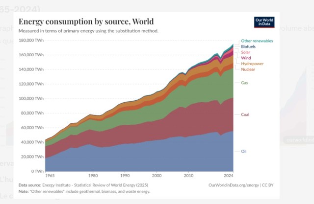 Et il ajoute : « Just as there was no transition from wood to coal, or from coal to oil, there is no transition from coal, oil and gas to renewables, even in electricity. »Les faits 2024-2025 confirment parfaitement cette analyseLe Statistical Review of World Energy 2025 (Energy Institute, ex-BP) est particulièrement explicite :Le monde est dans un mode « energy addition » (ajout d’énergie), et non dans une « clear transition » (transition claire).