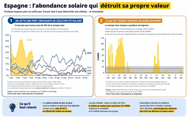 décrit avec précision un phénomène bien réel et documenté en Espagne : la saturation du système électrique face à la forte pénétration du solaire photovoltaïque et de l’éolien, sans stockage ni flexibilité suffisants. Cela génère du curtailment (déconnexion forcée de production), un effet de cannibalisation des prix (baisse massive des prix de marché aux heures de forte production renouvelable) et une explosion des coûts d’équilibrage du réseau.