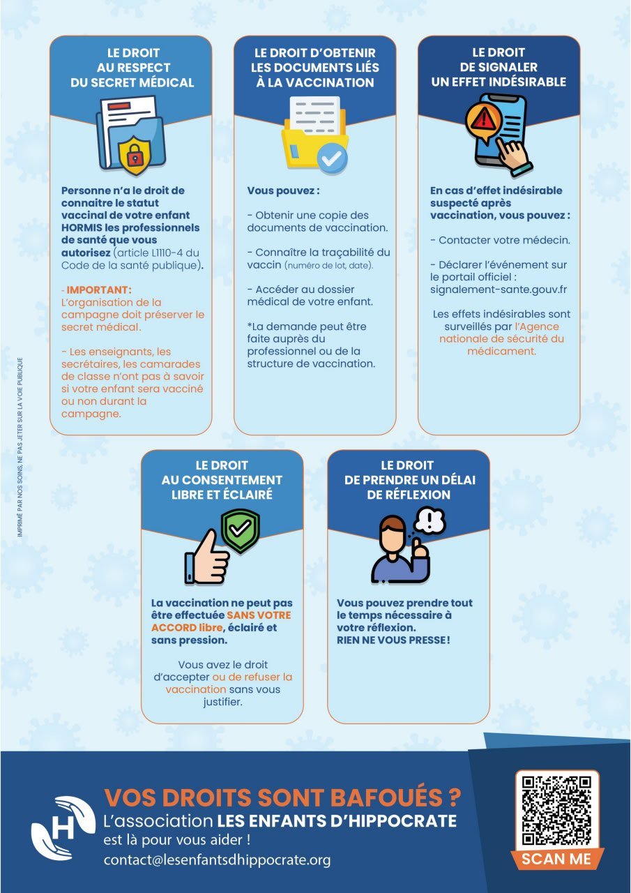 Par cette campagne d’information, nous réaffirmons l’importance de la souveraineté des personnes en matière de choix de santé. Les Enfants d’Hippocrate se tiennent aux côtés des familles souhaitant faire valoir leurs droits lorsqu’ils estiment que ceux-ci n’ont pas été respectés.